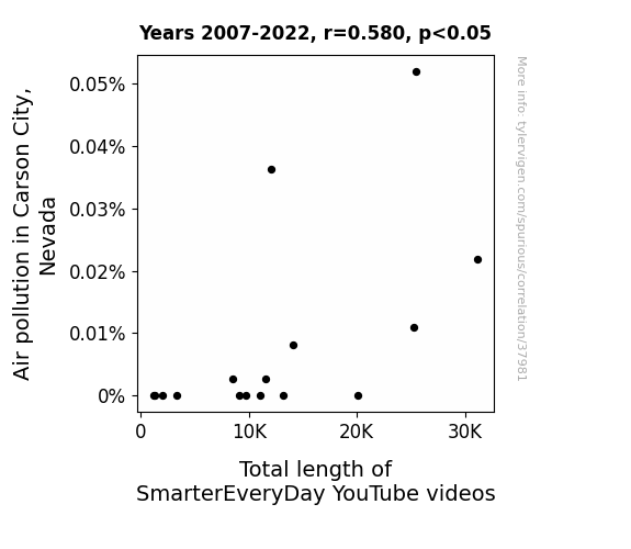 This means 33.7% of the change in the one variable (i.e., Total length of SmarterEveryDay YouTube videos) is predictable based on the change in the other (i.e., Air pollution in Carson City, Nevada) over the 16 years from 2007 through 2022.