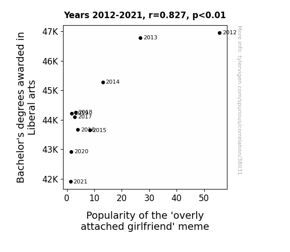 This means 68.4% of the change in the one variable (i.e., Popularity of the 'overly attached girlfriend' meme) is predictable based on the change in the other (i.e., Bachelor's degrees awarded in Liberal arts) over the 10 years from 2012 through 2021.