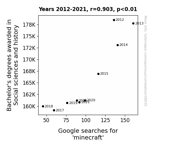 This means 81.6% of the change in the one variable (i.e., Google searches for 'minecraft') is predictable based on the change in the other (i.e., Bachelor's degrees awarded in Social sciences and history) over the 10 years from 2012 through 2021.