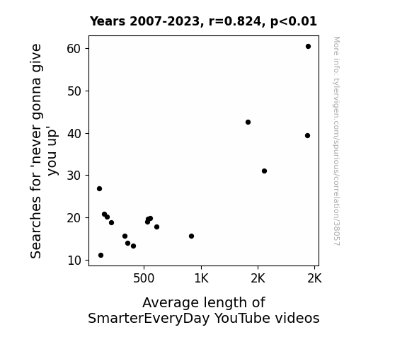 This means 67.9% of the change in the one variable (i.e., Average length of SmarterEveryDay YouTube videos) is predictable based on the change in the other (i.e., Searches for 'never gonna give you up') over the 17 years from 2007 through 2023.