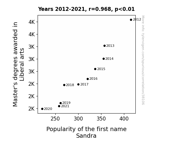 This means 93.6% of the change in the one variable (i.e., Popularity of the first name Sandra) is predictable based on the change in the other (i.e., Master's degrees awarded in Liberal arts) over the 10 years from 2012 through 2021.