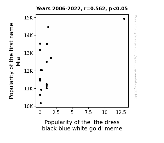 This means 31.5% of the change in the one variable (i.e., Popularity of the 'the dress black blue white gold' meme) is predictable based on the change in the other (i.e., Popularity of the first name Mia) over the 17 years from 2006 through 2022.