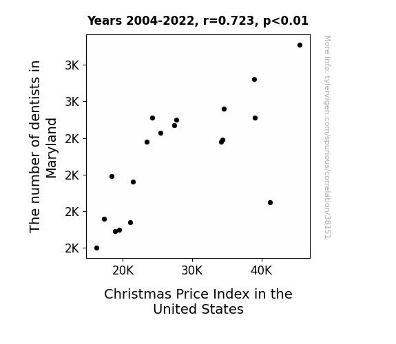 This means 52.3% of the change in the one variable (i.e., Christmas Price Index in the United States) is predictable based on the change in the other (i.e., The number of dentists in Maryland) over the 19 years from 2004 through 2022.