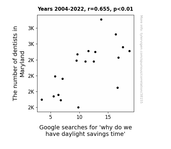 This means 42.9% of the change in the one variable (i.e., Google searches for 'why do we have daylight savings time') is predictable based on the change in the other (i.e., The number of dentists in Maryland) over the 19 years from 2004 through 2022.