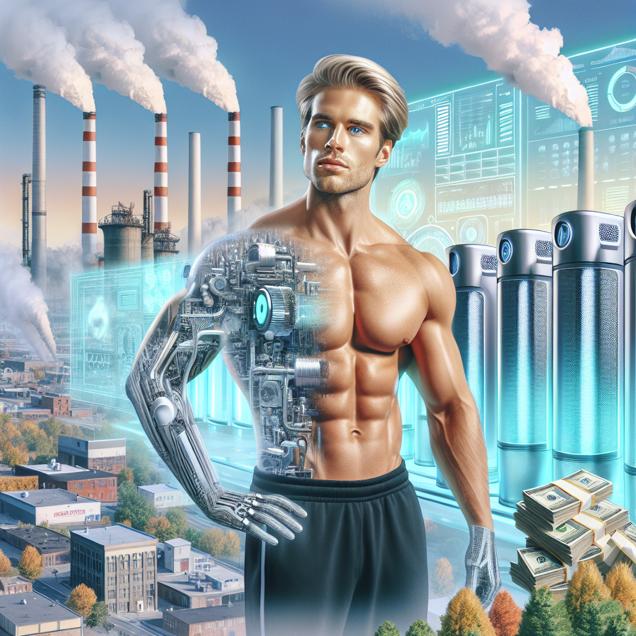 User prompt: Please respond with an image generation prompt that would be likely to create an interesting visual using DALLE-3, using the following style: [ High-tech ] and depicting this scene: In Central City, Kentucky, the air is thick with pollution as factories release smoke into the sky. Amidst the haze, Brad Pitt is seen showcasing an innovative air purifier technology, surrounded by stacks of money representing his impressive net worth. Keep the visual depiction simple. Do not include any words or speech bubbles.