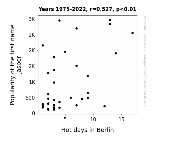This means 27.7% of the change in the one variable (i.e., Hot days in Berlin) is predictable based on the change in the other (i.e., Popularity of the first name Jasper) over the 39 years from 1975 through 2022.