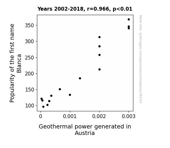This means 93.4% of the change in the one variable (i.e., Geothermal power generated in Austria) is predictable based on the change in the other (i.e., Popularity of the first name Blanca) over the 17 years from 2002 through 2018.