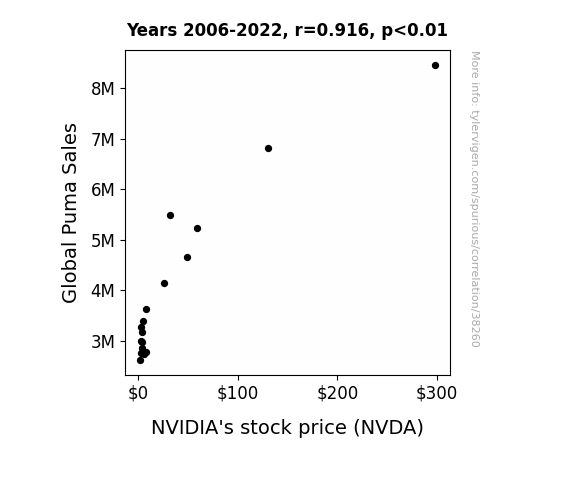 This means 83.9% of the change in the one variable (i.e., NVIDIA's stock price (NVDA)) is predictable based on the change in the other (i.e., Global Puma Sales) over the 17 years from 2006 through 2022.
