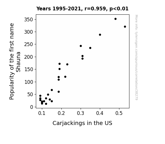This means 91.9% of the change in the one variable (i.e., Carjackings in the US) is predictable based on the change in the other (i.e., Popularity of the first name Shauna) over the 27 years from 1995 through 2021.