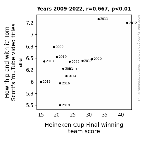 This means 44.5% of the change in the one variable (i.e., Heineken Cup Final winning team score) is predictable based on the change in the other (i.e., How 'hip and with it' Tom Scott's YouTube video titles are) over the 14 years from 2009 through 2022.