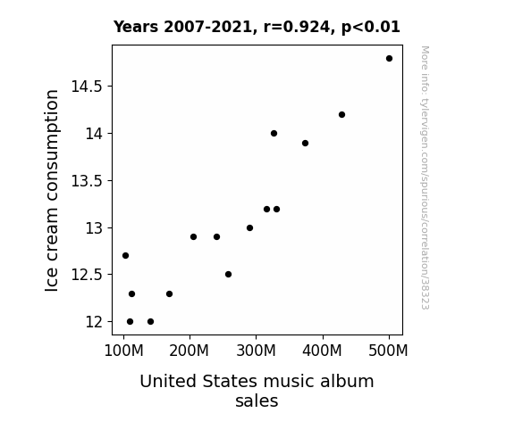 This means 85.3% of the change in the one variable (i.e., United States music album sales) is predictable based on the change in the other (i.e., Ice cream consumption) over the 15 years from 2007 through 2021.