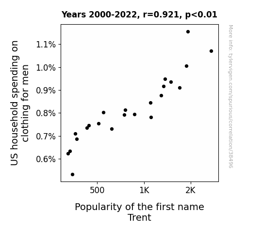 This means 84.8% of the change in the one variable (i.e., Popularity of the first name Trent) is predictable based on the change in the other (i.e., US household spending on clothing for men) over the 23 years from 2000 through 2022.