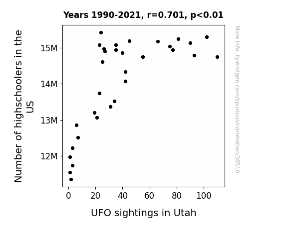 This means 49.2% of the change in the one variable (i.e., UFO sightings in Utah) is predictable based on the change in the other (i.e., Number of highschoolers in the US) over the 32 years from 1990 through 2021.