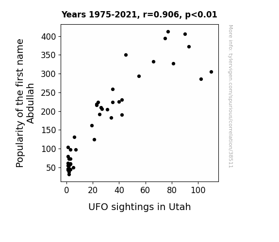 This means 82.1% of the change in the one variable (i.e., UFO sightings in Utah) is predictable based on the change in the other (i.e., Popularity of the first name Abdullah) over the 47 years from 1975 through 2021.
