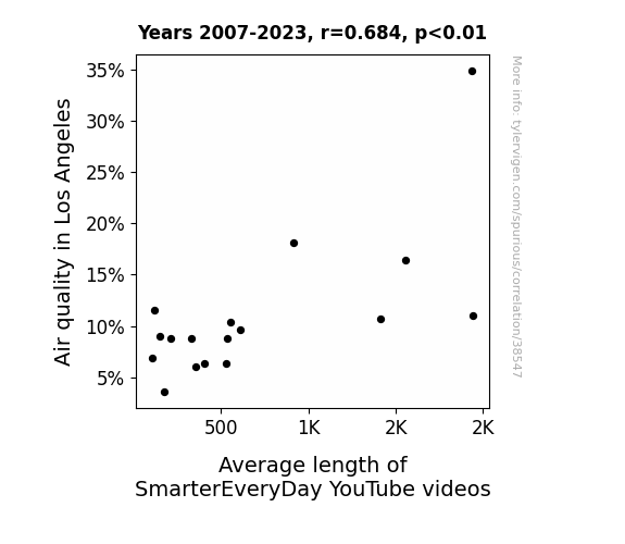 This means 46.7% of the change in the one variable (i.e., Average length of SmarterEveryDay YouTube videos) is predictable based on the change in the other (i.e., Air quality in Los Angeles) over the 17 years from 2007 through 2023.