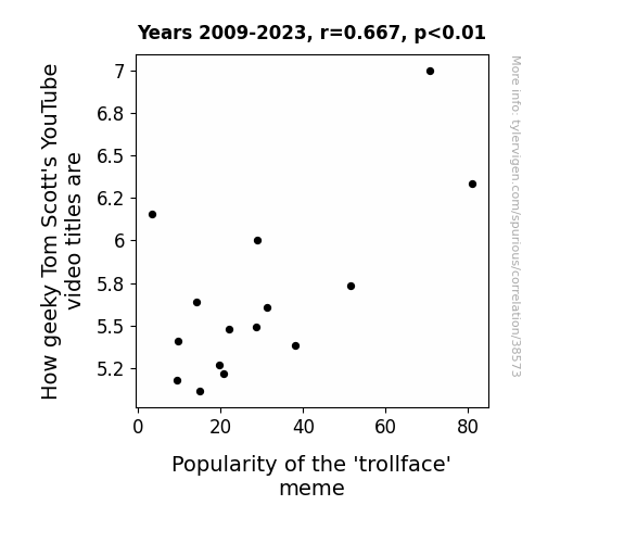 This means 44.5% of the change in the one variable (i.e., Popularity of the 'trollface' meme) is predictable based on the change in the other (i.e., How geeky Tom Scott's YouTube video titles are) over the 15 years from 2009 through 2023.