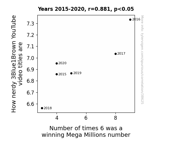 This means 77.7% of the change in the one variable (i.e., Number of times 6 was a winning Mega Millions number) is predictable based on the change in the other (i.e., How nerdy 3Blue1Brown YouTube video titles are) over the 6 years from 2015 through 2020.