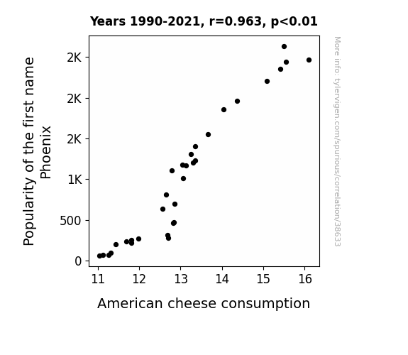 This means 92.8% of the change in the one variable (i.e., American cheese consumption) is predictable based on the change in the other (i.e., Popularity of the first name Phoenix) over the 32 years from 1990 through 2021.