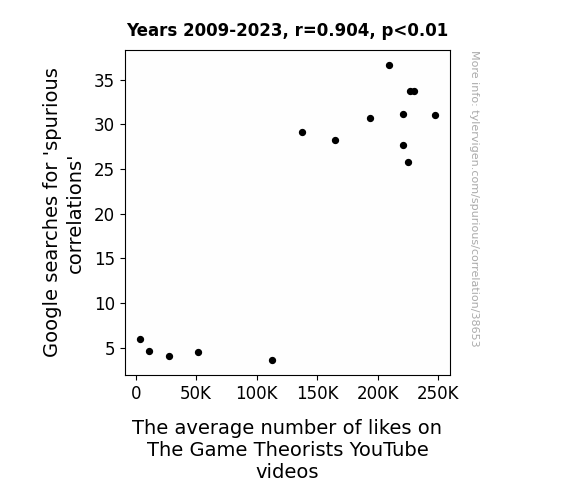 This means 81.7% of the change in the one variable (i.e., The average number of likes on The Game Theorists YouTube videos) is predictable based on the change in the other (i.e., Google searches for 'spurious correlations') over the 15 years from 2009 through 2023.