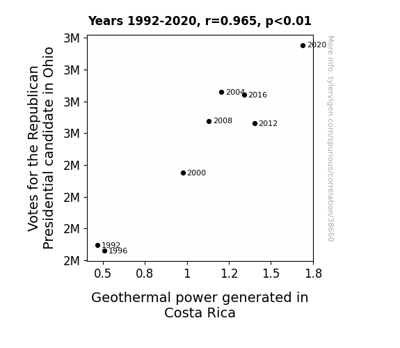 This means 93.2% of the change in the one variable (i.e., Geothermal power generated in Costa Rica) is predictable based on the change in the other (i.e., Votes for the Republican Presidential candidate in Ohio) over the 8 years from 1992 through 2020.