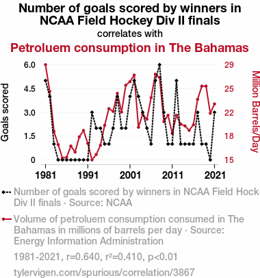 - The spurious research paper: Scoring a Fuel Goal: The Curious Connection between NCAA Field Hockey Div II Finals and Petroleum Consumption in The Bahamas