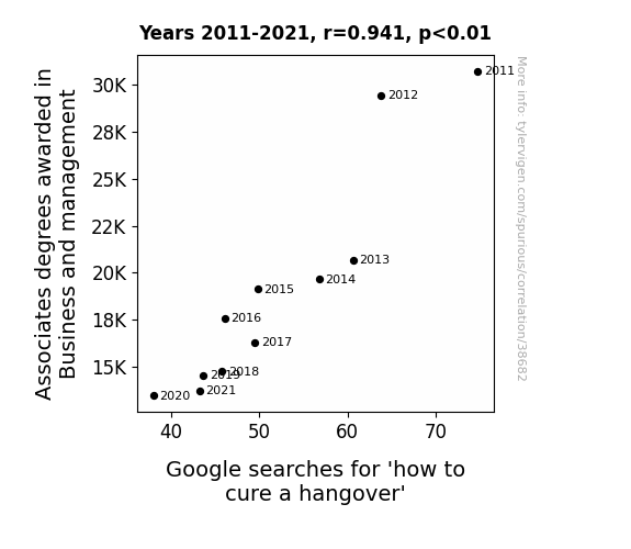 This means 88.6% of the change in the one variable (i.e., Google searches for 'how to cure a hangover') is predictable based on the change in the other (i.e., Associates degrees awarded in Business and management) over the 11 years from 2011 through 2021.