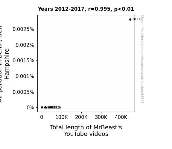This means 99% of the change in the one variable (i.e., Total length of MrBeast's YouTube videos) is predictable based on the change in the other (i.e., Air pollution in Berlin, New Hampshire) over the 6 years from 2012 through 2017.