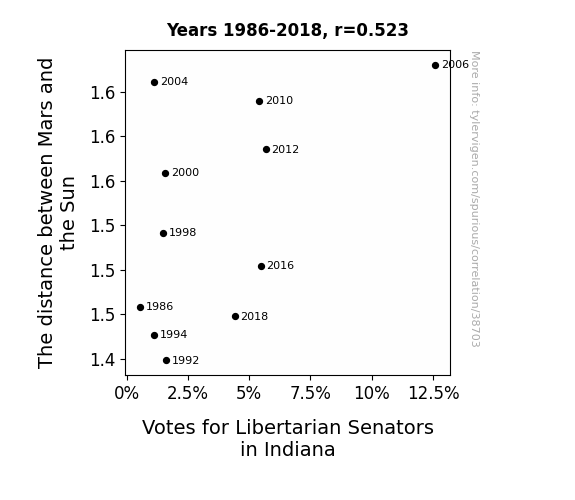 This means 27.3% of the change in the one variable (i.e., Votes for Libertarian Senators in Indiana) is predictable based on the change in the other (i.e., The distance between Mars and the Sun) over the 11 years from 1986 through 2018.