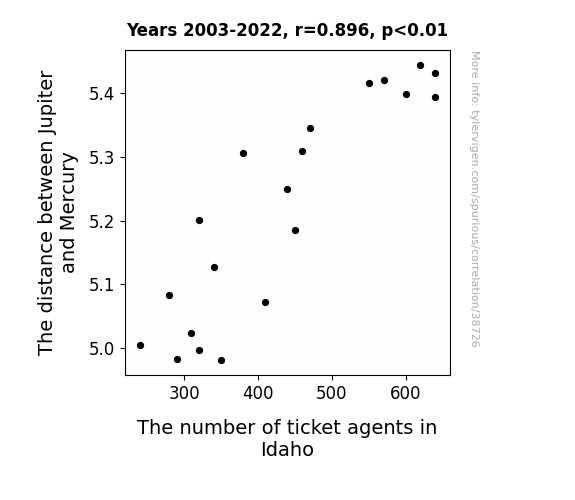 This means 80.2% of the change in the one variable (i.e., The number of ticket agents in Idaho) is predictable based on the change in the other (i.e., The distance between Jupiter and Mercury) over the 20 years from 2003 through 2022.