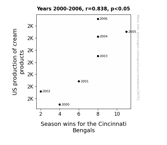 This means 70.2% of the change in the one variable (i.e., Season wins for the Cincinnati Bengals) is predictable based on the change in the other (i.e., US production of cream products) over the 7 years from 2000 through 2006.