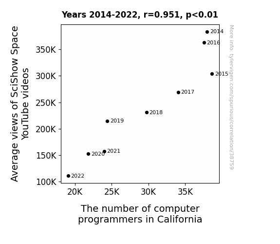 This means 90.5% of the change in the one variable (i.e., The number of computer programmers in California) is predictable based on the change in the other (i.e., Average views of SciShow Space YouTube videos) over the 9 years from 2014 through 2022.