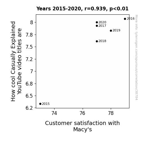 This means 88.2% of the change in the one variable (i.e., Customer satisfaction with Macy's) is predictable based on the change in the other (i.e., How cool Casually Explained YouTube video titles are) over the 6 years from 2015 through 2020.