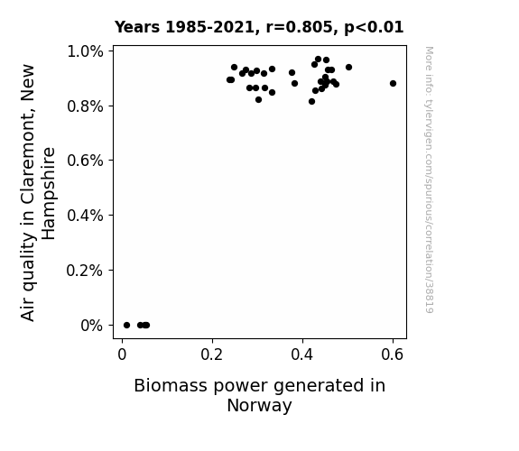 This means 64.9% of the change in the one variable (i.e., Biomass power generated in Norway) is predictable based on the change in the other (i.e., Air quality in Claremont, New Hampshire) over the 37 years from 1985 through 2021.