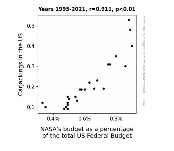 This means 82.9% of the change in the one variable (i.e., NASA's budget as a percentage of the total US Federal Budget) is predictable based on the change in the other (i.e., Carjackings in the US) over the 27 years from 1995 through 2021.