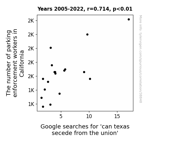 This means 51% of the change in the one variable (i.e., Google searches for 'can texas secede from the union') is predictable based on the change in the other (i.e., The number of parking enforcement workers in California) over the 18 years from 2005 through 2022.