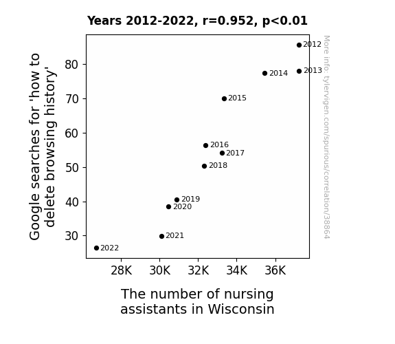 This means 90.7% of the change in the one variable (i.e., The number of nursing assistants in Wisconsin) is predictable based on the change in the other (i.e., Google searches for 'how to delete browsing history') over the 11 years from 2012 through 2022.