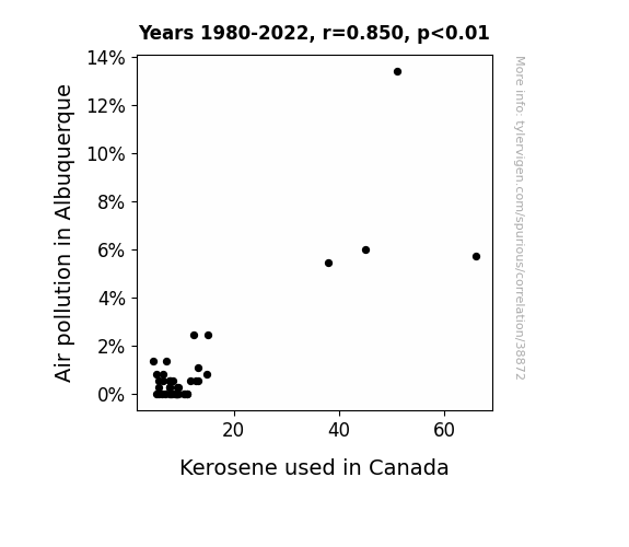 This means 72.3% of the change in the one variable (i.e., Kerosene used in Canada) is predictable based on the change in the other (i.e., Air pollution in Albuquerque) over the 43 years from 1980 through 2022.