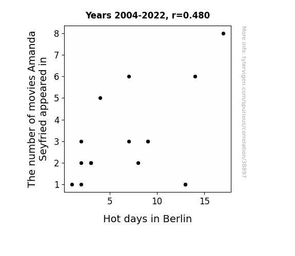 This means 23.1% of the change in the one variable (i.e., Hot days in Berlin) is predictable based on the change in the other (i.e., The number of movies Amanda Seyfried appeared in) over the 17 years from 2004 through 2022.