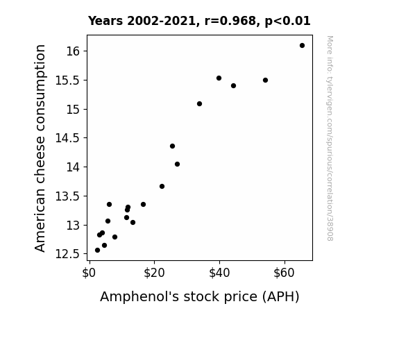 This means 93.7% of the change in the one variable (i.e., Amphenol's stock price (APH)) is predictable based on the change in the other (i.e., American cheese consumption) over the 20 years from 2002 through 2021.