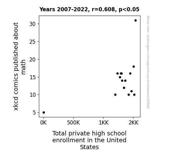 This means 37% of the change in the one variable (i.e., Total private high school enrollment in the United States) is predictable based on the change in the other (i.e., xkcd comics published about math) over the 16 years from 2007 through 2022.