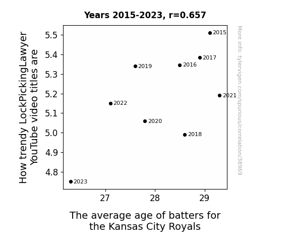 This means 43.1% of the change in the one variable (i.e., The average age of batters for the Kansas City Royals) is predictable based on the change in the other (i.e., How trendy LockPickingLawyer YouTube video titles are) over the 9 years from 2015 through 2023.