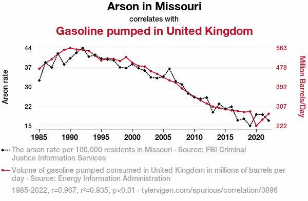 - The spurious research paper: Burning Issues: Exploring the Fiery Relationship between Arson in Missouri and Gasoline in the United Kingdom
