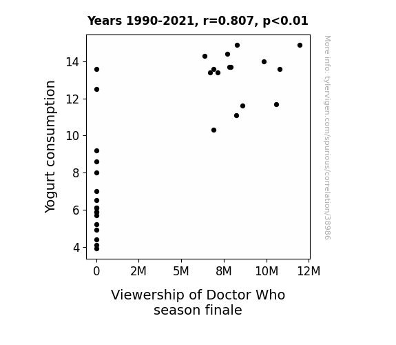This means 65.1% of the change in the one variable (i.e., Viewership of Doctor Who season finale) is predictable based on the change in the other (i.e., Yogurt consumption) over the 32 years from 1990 through 2021.