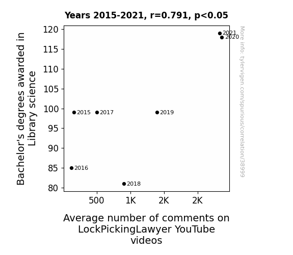 This means 62.5% of the change in the one variable (i.e., Average number of comments on LockPickingLawyer YouTube videos) is predictable based on the change in the other (i.e., Bachelor's degrees awarded in Library science) over the 7 years from 2015 through 2021.