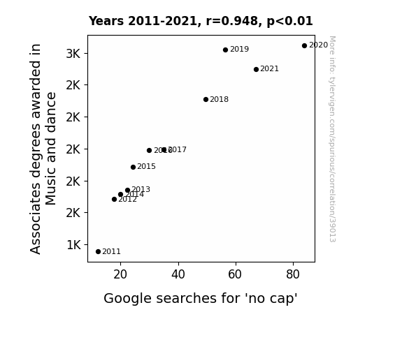 This means 89.9% of the change in the one variable (i.e., Google searches for 'no cap') is predictable based on the change in the other (i.e., Associates degrees awarded in Music and dance) over the 11 years from 2011 through 2021.