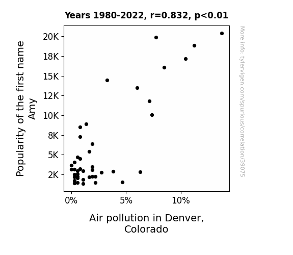 This means 69.3% of the change in the one variable (i.e., Air pollution in Denver, Colorado) is predictable based on the change in the other (i.e., Popularity of the first name Amy) over the 43 years from 1980 through 2022.