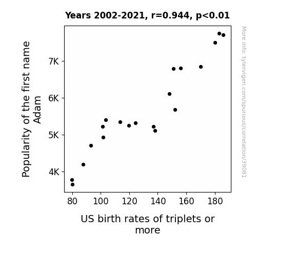 This means 89% of the change in the one variable (i.e., US birth rates of triplets or more) is predictable based on the change in the other (i.e., Popularity of the first name Adam) over the 20 years from 2002 through 2021.