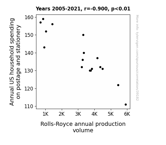 This means 81% of the change in the one variable (i.e., Rolls-Royce annual production volume) is predictable based on the change in the other (i.e., Annual US household spending on postage and stationery) over the 17 years from 2005 through 2021.