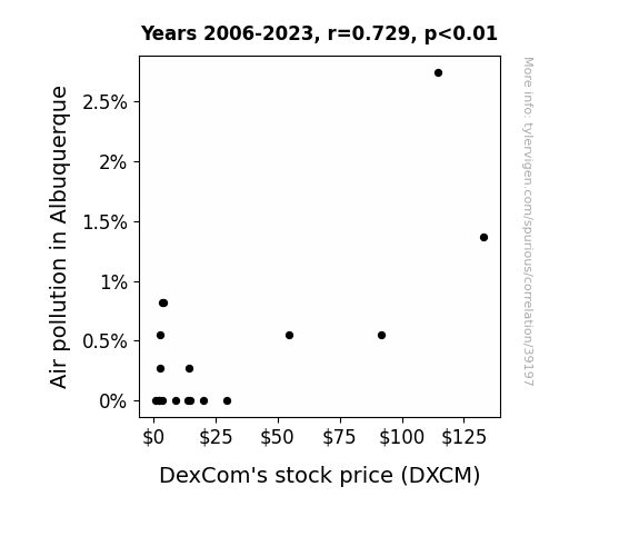 This means 53.2% of the change in the one variable (i.e., DexCom's stock price (DXCM)) is predictable based on the change in the other (i.e., Air pollution in Albuquerque) over the 18 years from 2006 through 2023.