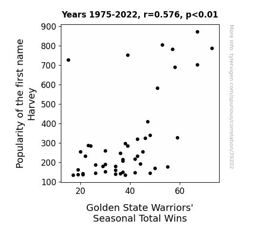 This means 33.1% of the change in the one variable (i.e., Golden State Warriors' Seasonal Total Wins) is predictable based on the change in the other (i.e., Popularity of the first name Harvey) over the 48 years from 1975 through 2022.